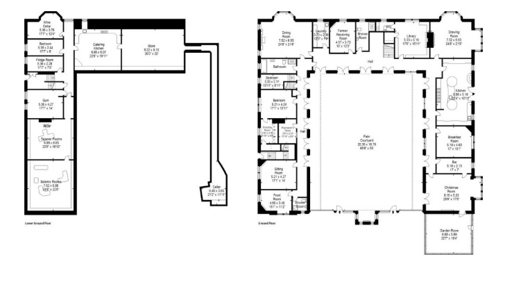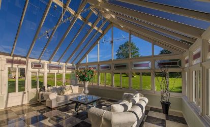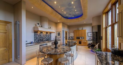 The traditional library has beautiful carved and intricate glass fronted display cases ,with ensuite toilet and walk in safe / gun cabinet. Adorning the north east corner with rear and side facing windows is the elegant drawing room. The heart of the home is the particularly generous dining sized presentation kitchen fitted with an extensive and comprehensive range of luxury bespoke hand made cabinets, complemented by granite work surfaces. Integrated luxury appliances are by Wolf, Sub-zero, Siemens and Fischer and Paykel. The focal point is the elongated curved central island. An informal start to the day is provided through the double doors to an open sitting area. An adjacent breakfast room offers a more formal start while further down the oak lined corridor is the cocktail bar with its striking black and white porcelain tiled floor. Sympathetically retained is The Christmas room which has no less than four points of access. In turn this room leads to the garden room which leads out to the formal gardens.