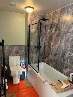 The lounge is a well-proportioned and comfortable living space, enjoying good natural light through a double glazed window. There are two bedrooms, comprising a generous double bedroom and a good-sized single bedroom, both served by a modern white bathroom suite that has been modernised with luxury laminate flooring, vanity sink with plenty of storage space, mirror, new toilet, bath, black effect towel rail, shower and taps and shower screen and shower panels.